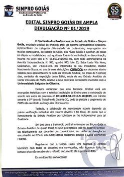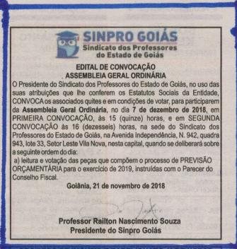 EDITAL DE CONVOCAÇÃO ASSEMBLEIA GERAL ORDINÁRIA O Presidente do Sindicato dos Professores do Estado de Goiás, no uso das suas atribuições que lhe conferem