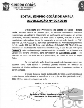 O Sindicato dos Professores do Estado de Goiás – Sinpro Goiás CONVOCA todos os docentes que mantém contrato de trabalho com a Universidade Salgado de Oliveira